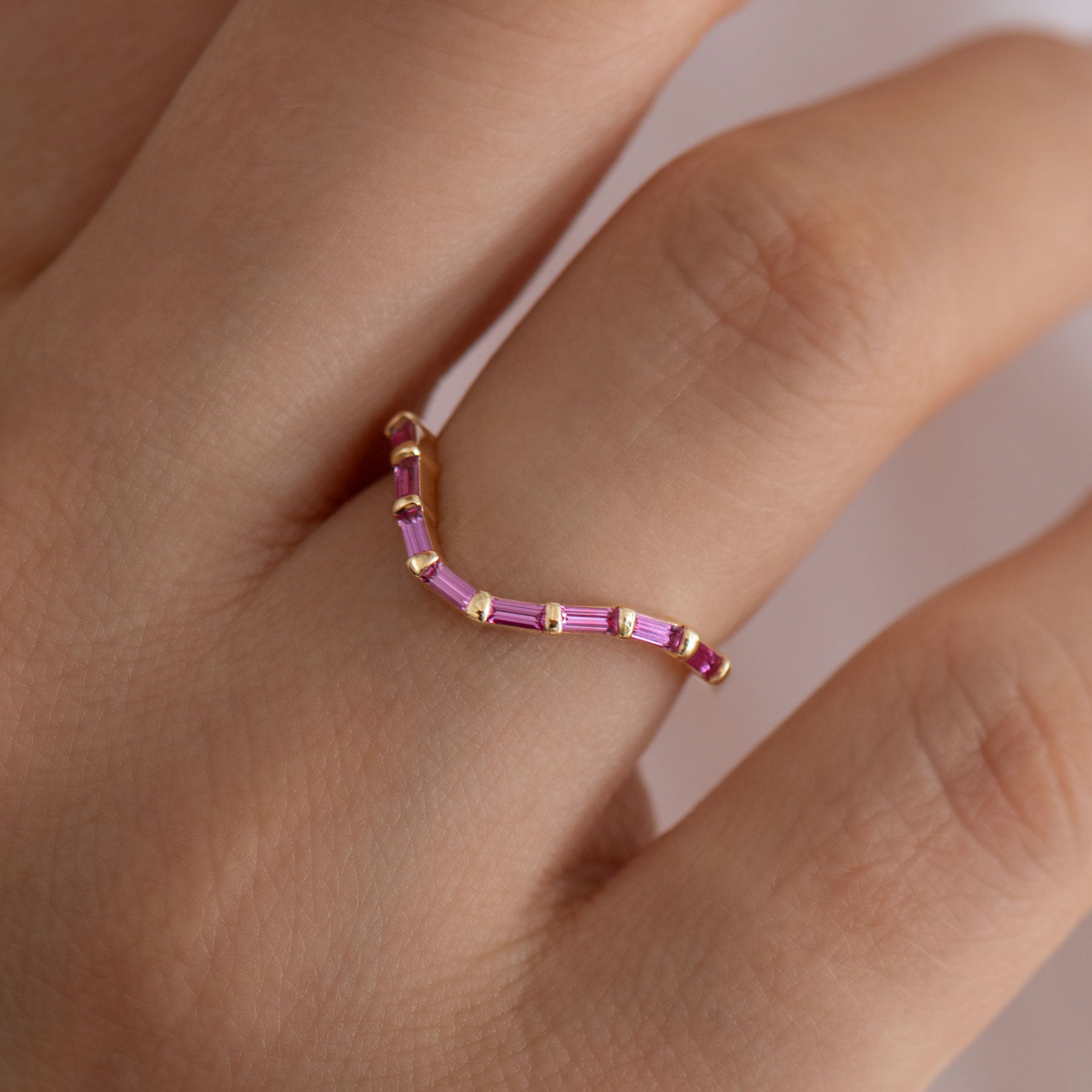 0.35 ct Pink Sapphire Baguettes set in a curved band in 18kt yellow gold