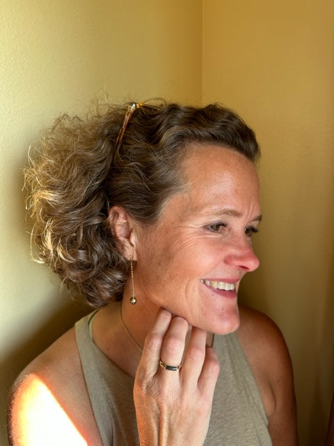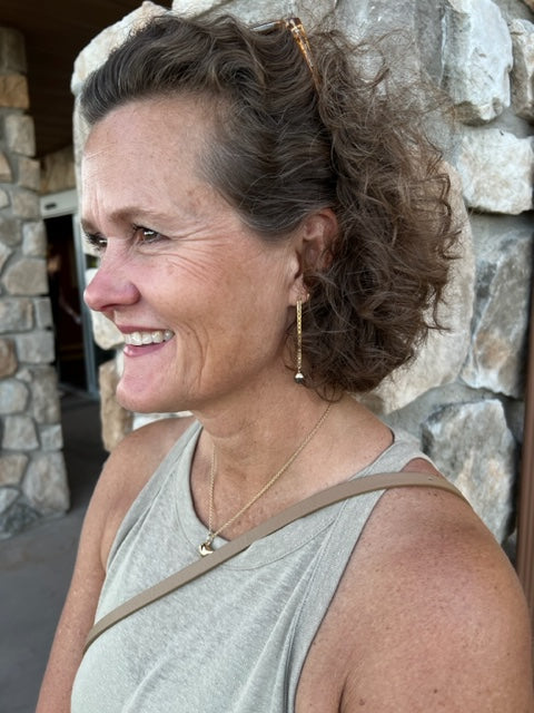 This lovely customer had selected some lovely dinosaur bone from Kerri's private collection. She had a part of the piece cut to fit into an existing ring mounting. We then hand cut two spheres from the dino bone and had a hand forged gold cup made for them and dropped them off of long chains. Dazzling!