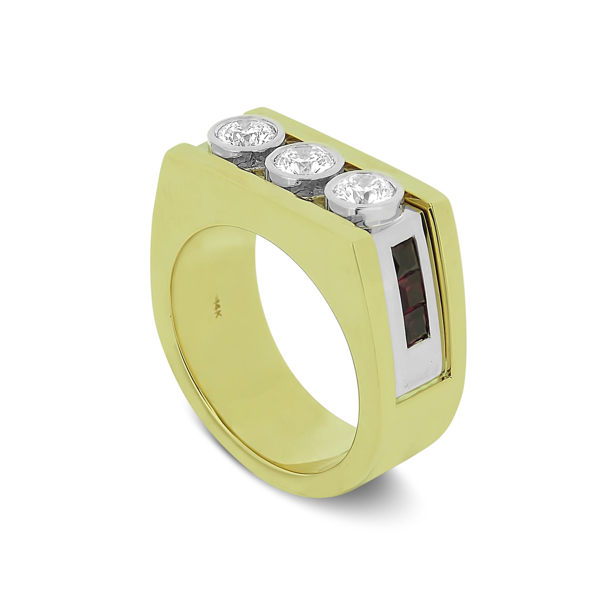 This Colorado customer desired a ring that would represent his rugged outdoor lifestyle, yet have a timeless, professional look. The artist had rubies cut to fit the ring going down the sides and bezel set three new diamonds across the top. Remember, at The Jewelers Vault, we can redesign your stones or create a heirloom piece of jewelry with all new gem stones.