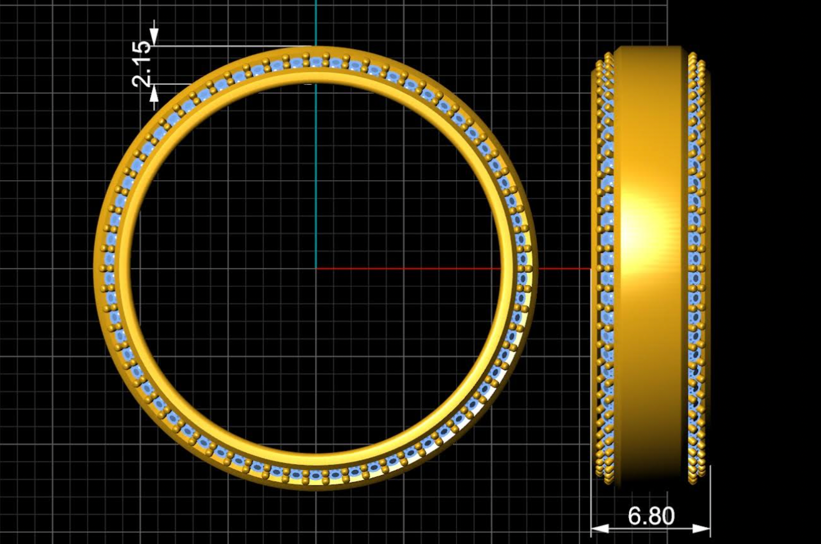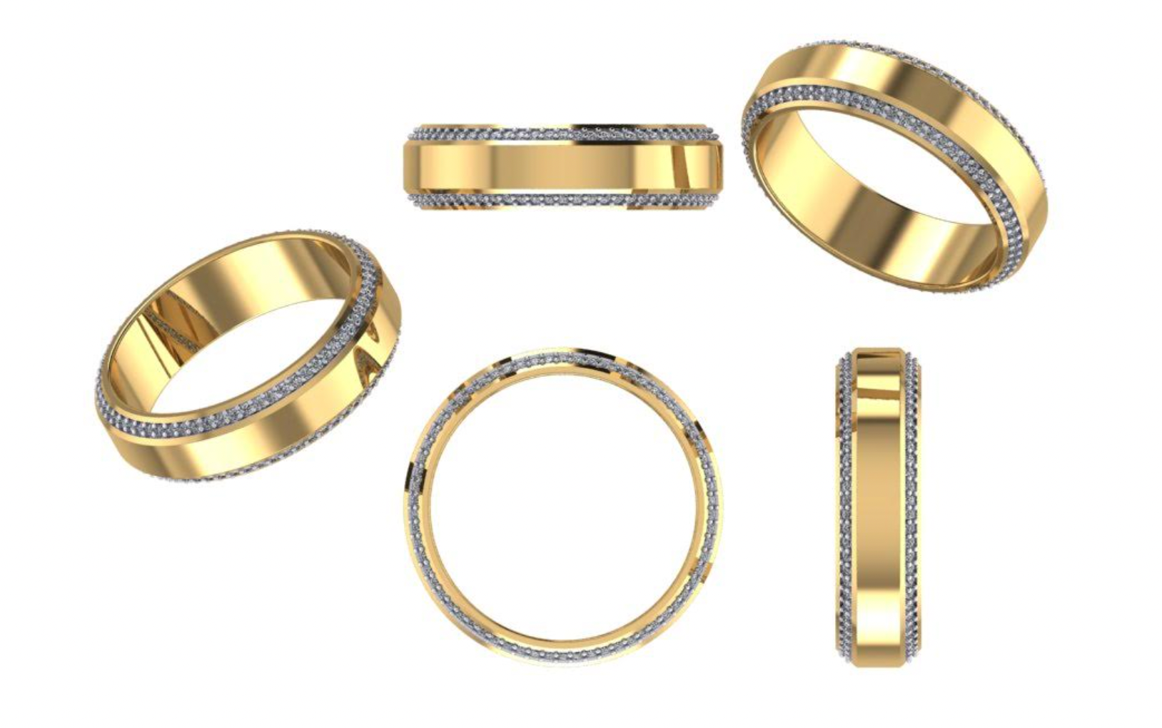 Custom 14kt yellow gold wedding band with white diamond pave on a slant