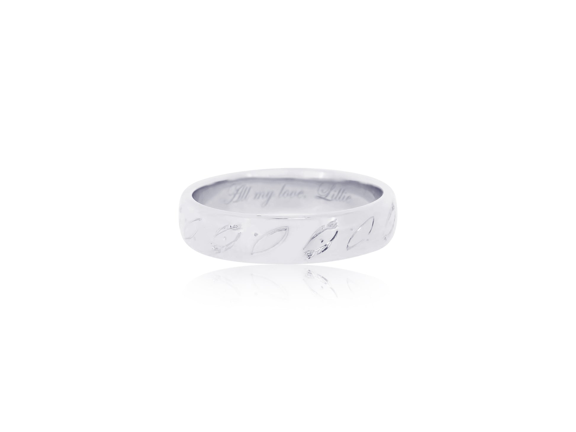 This very special couple first had us custom design her engagement ring and she wanted her husband to have the same treasured experience. The client is an artist and drew a meaningful pattern. We first hand fabricated a 6mm white gold ring and then hand etched the pattern into the ring. A treasured heirloom for generations to come.