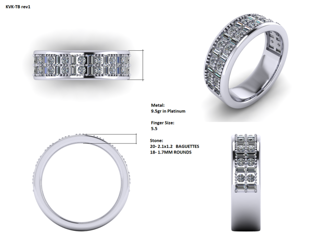 This sweet customer had her mother's diamond line bracelet and baguette cut diamonds off of a pendant. The artist designed a hand fabricated platinum band with her brilliant cut diamonds alternating with the baguette diamonds. This band turned out beautiful! The client can now enjoy the diamonds and wear them everyday....with sentimental memories of her mom!