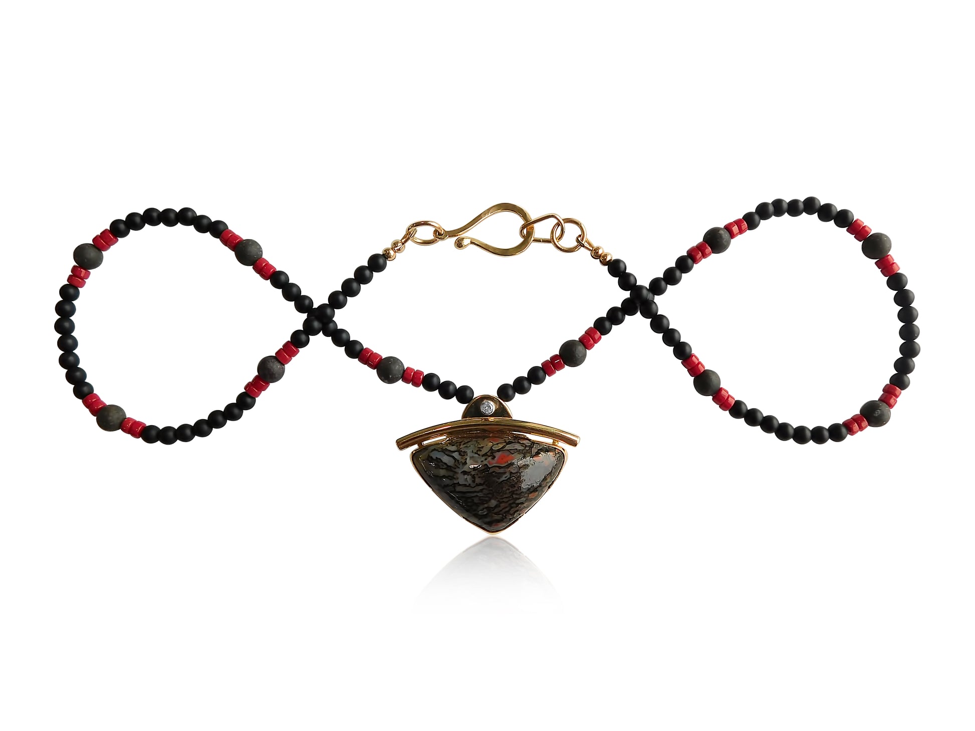 18" long beaded necklace is of matted onyx, Einstein grey cobblestone beads, vintage red coral rondelle beads.