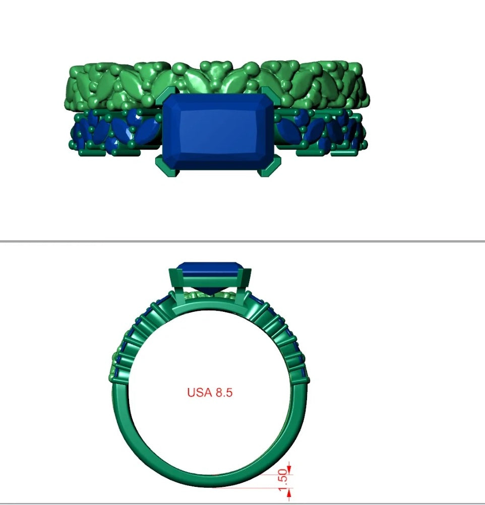 We set the elongated radiant cut diamond east to west in this stunning ring. Then we hand carved the wax for the wedding band to hug the exact layout of the diamonds on the engagement ring. This combination of rings are breathtaking and we congratulate this outstanding couple.