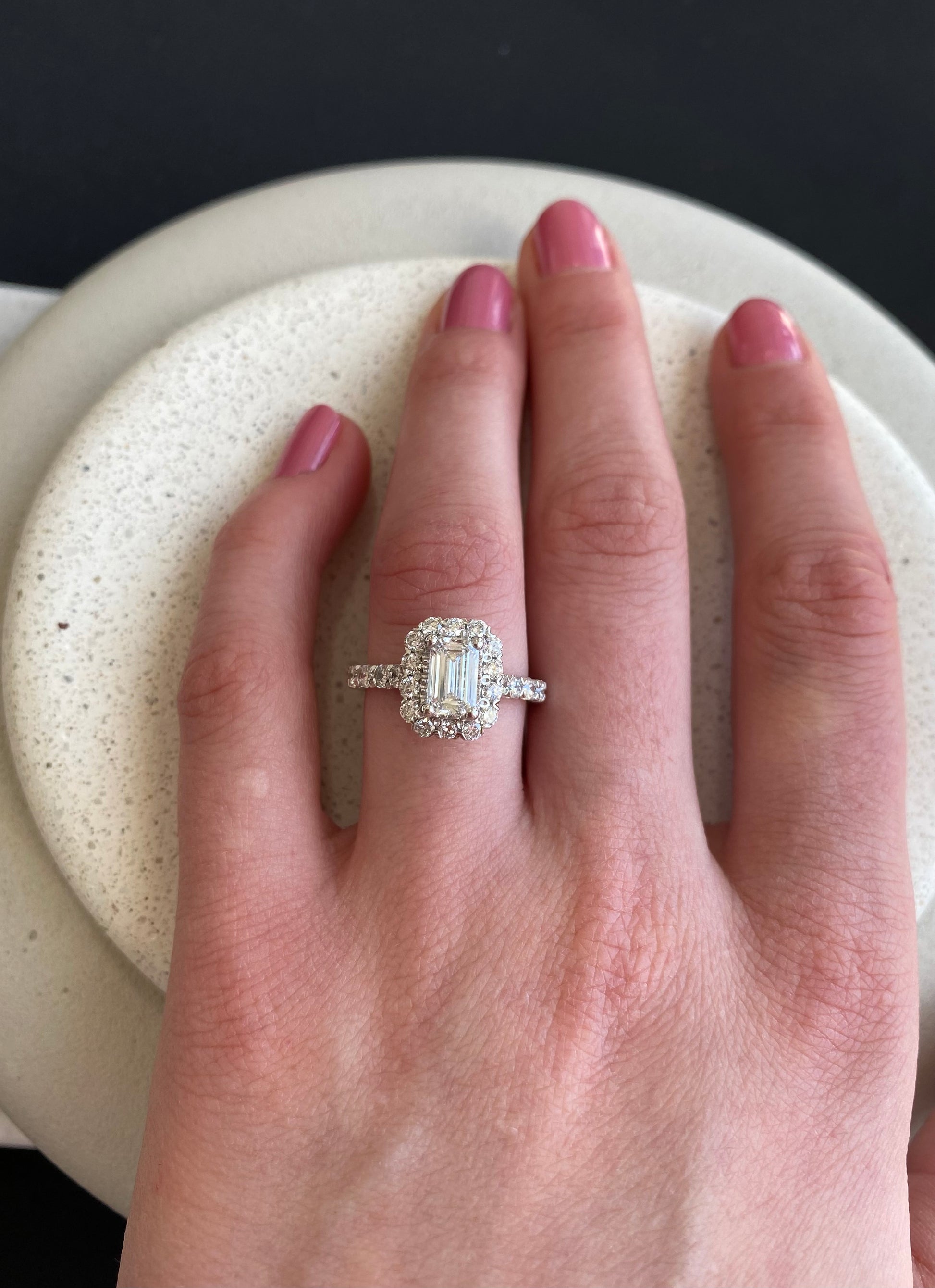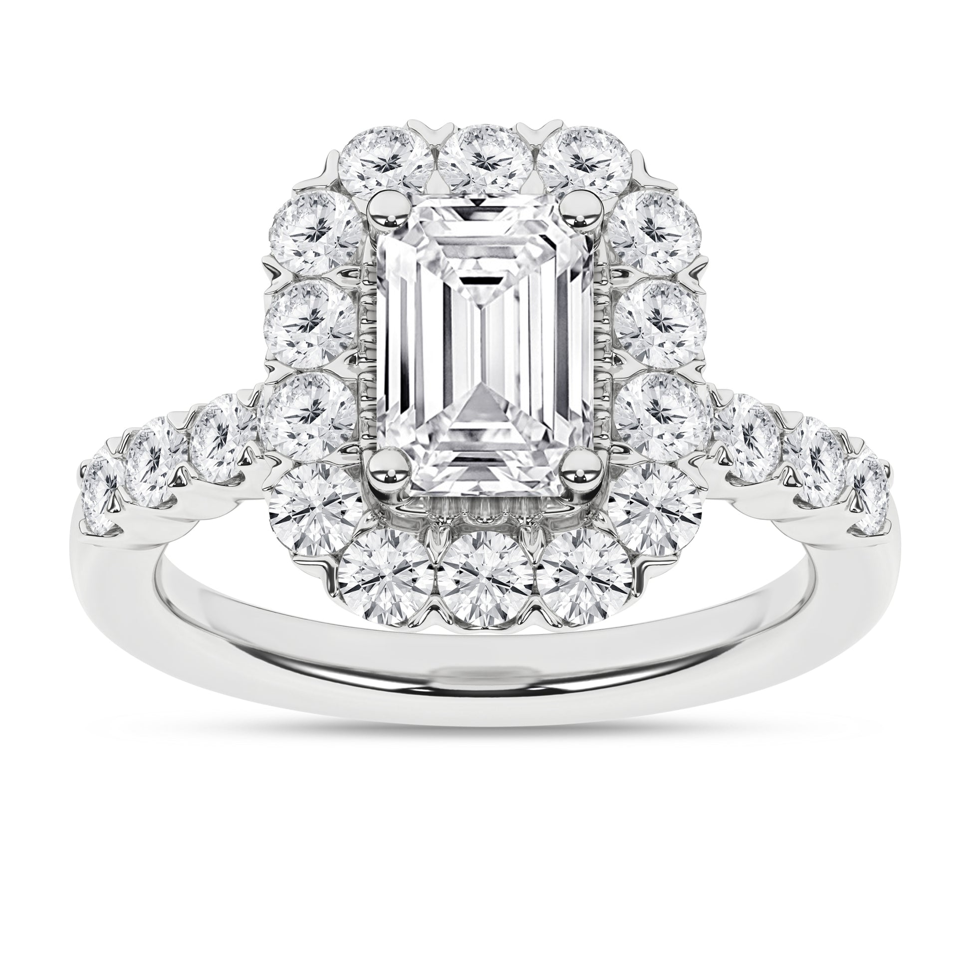 1 ct emerald lab grown diamond engagement ring with 8/9 tcw round brilliant lab grown diamond halo, meticulously set in 14KT white gold.