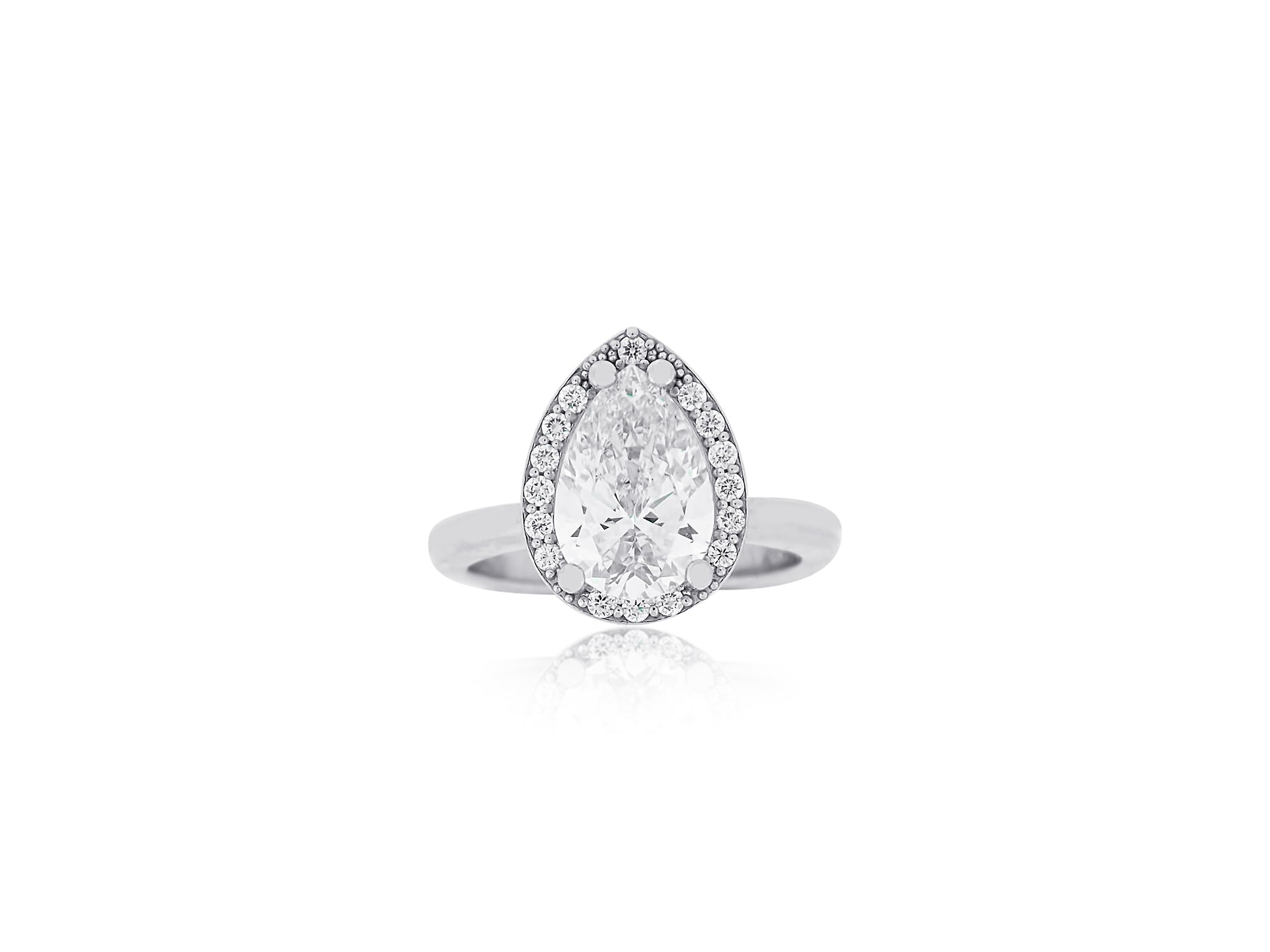 This darling young customer wanted a classic ring design. She selected a beautiful pear cut diamond, set with four prongs. She accented the center stone with a diamond halo. This is the perfect design to add stacking bands too.