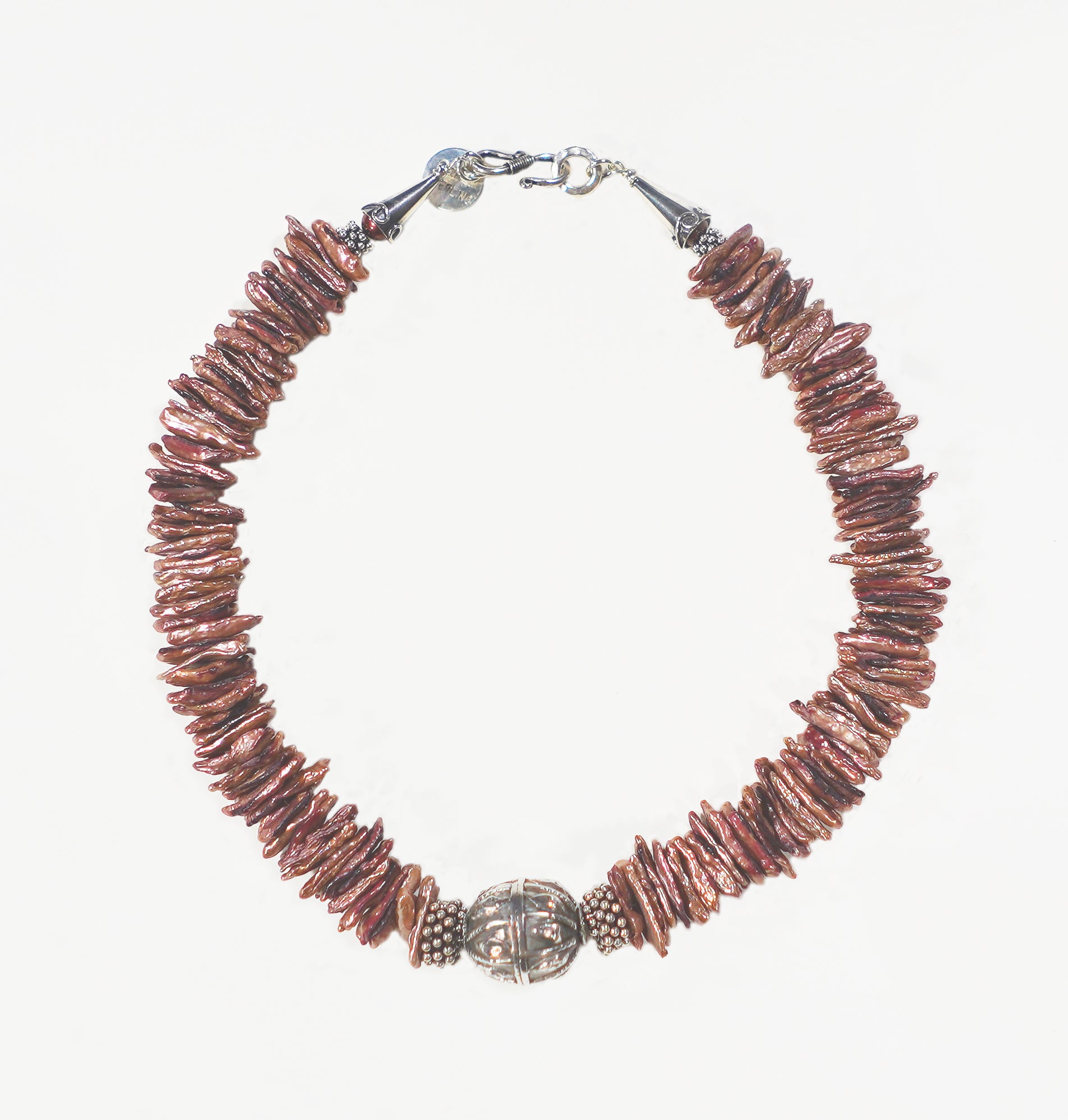 Japanese freshwater keishi pearls enhanced to a striking maroon color.