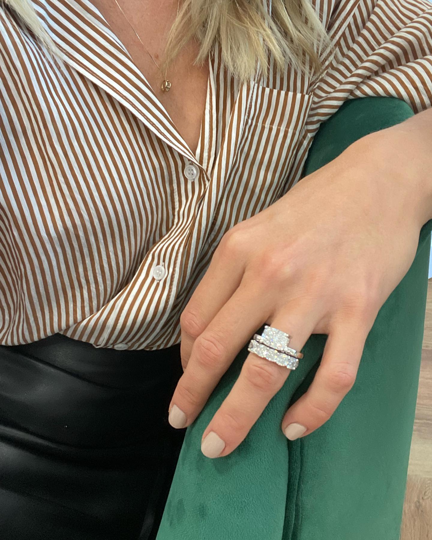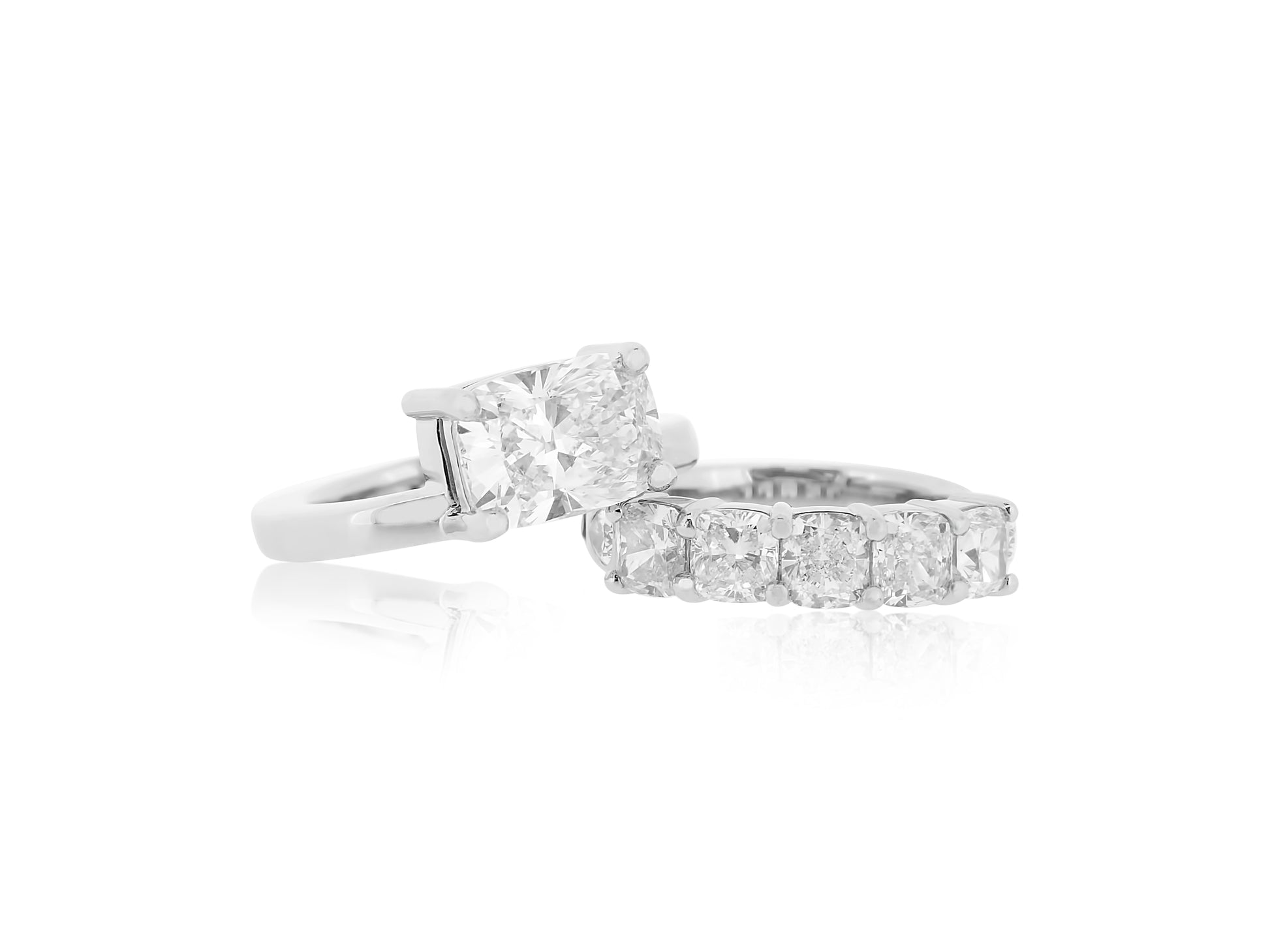 Stunning elongated cushion cut off set on a narrow platinum band. Nested against a cushion cut diamond band. The way the artist designed this it allows for maximum impact using a large diamond within a limited space.