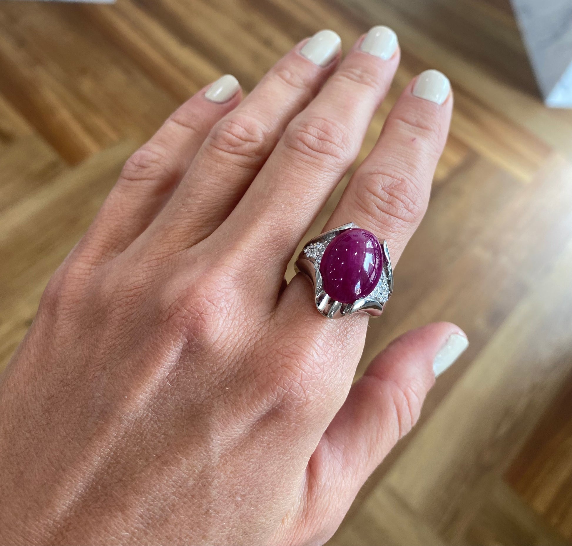 Measurement of ruby: 16.27 x 12.34 x 8.57mm, approximately 18.58 carats, cabochon cut. The actual stone is more pink than photo shows.