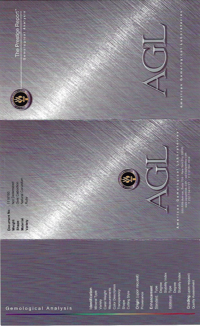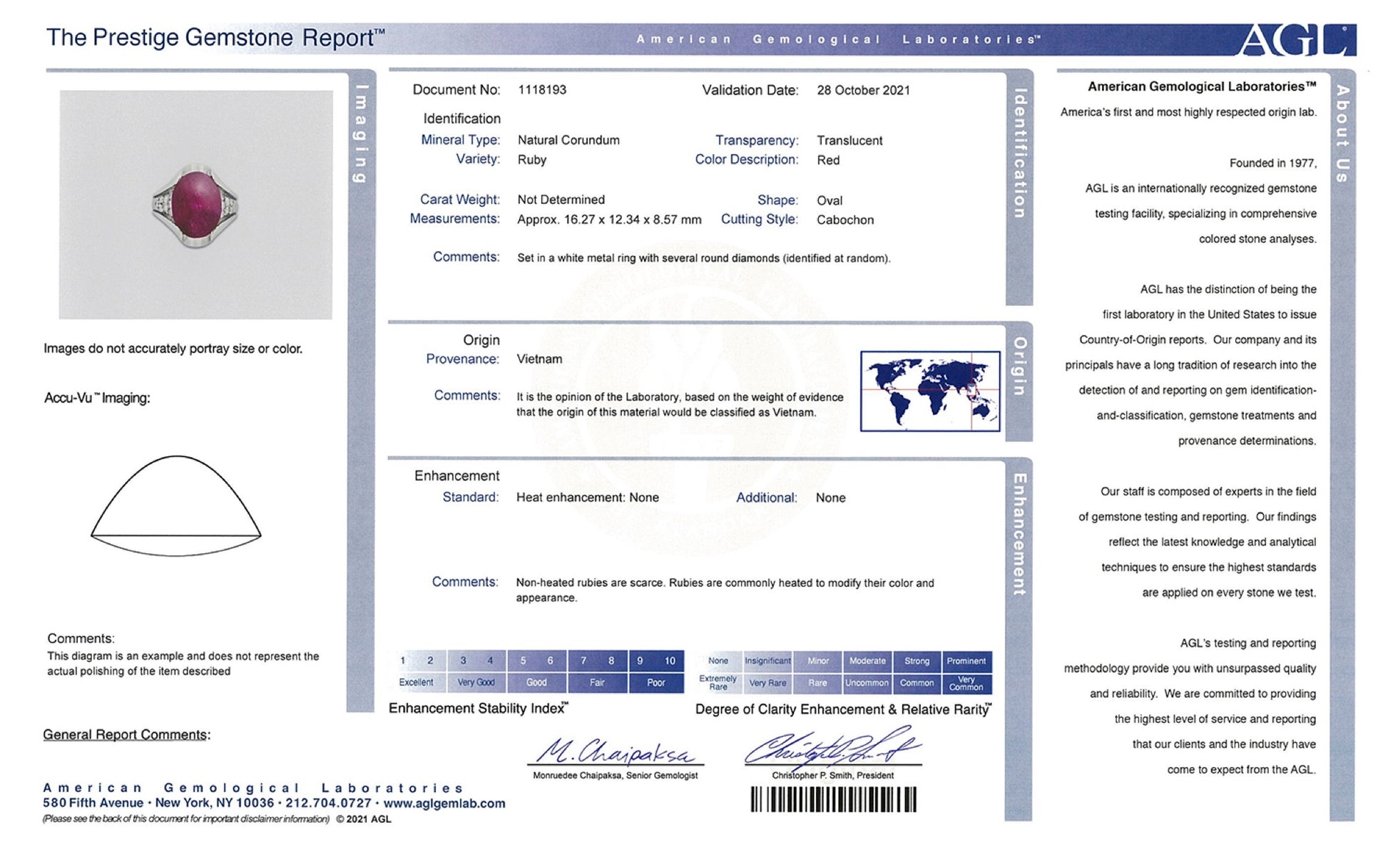 Certified non heated ruby. The American Gemological Laboratories analysis with "The Prestige Report" the ruby in this ring is "none heat enhancement". "Non-heated rubies are scarce." The report will be given to the buyer of this investment quality stone.