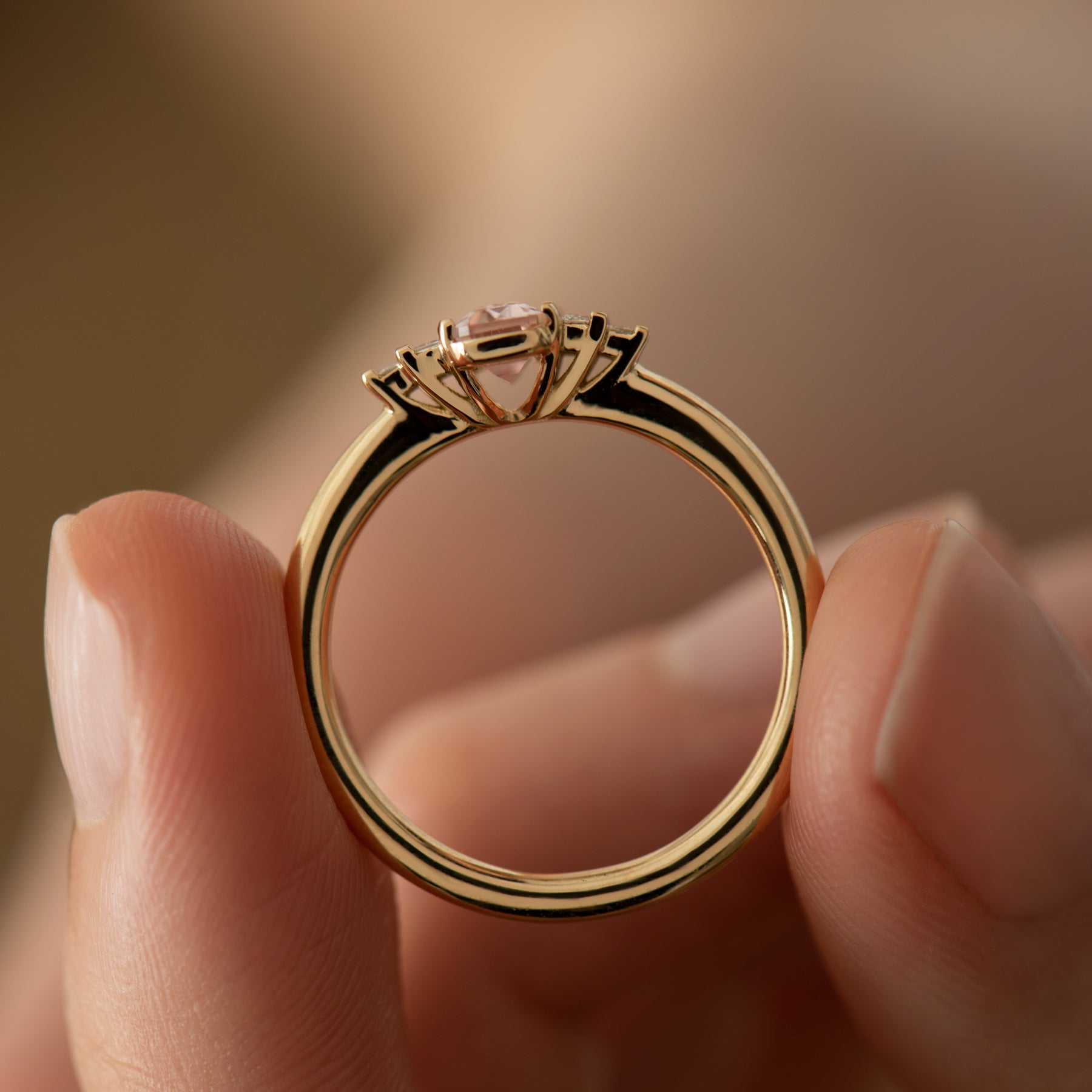 0.60 ct Petal Pink Morganite and 0.10 ct White Baguette Diamonds set in 18kt Yellow Gold. This ring is one-of-a-kind.