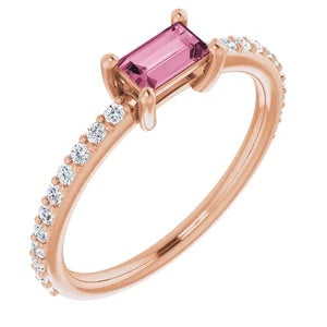 4.5 x 2.5 mm pink sapphire baguette (approx. 0.28 ct) with 0.15 ct white diamonds set in 14 kt rose gold