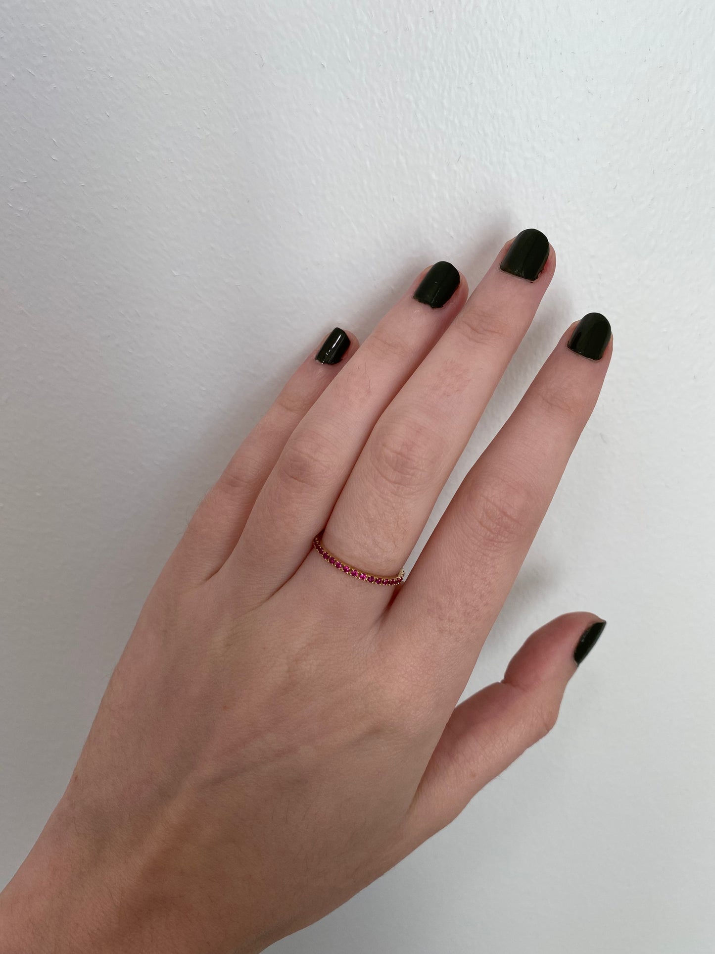 This fiery band was created by famed designer Kimberly Collins. It features ~0.35 ct of rubies housed in 18kt yellow gold. This ring is sized at 6.5.