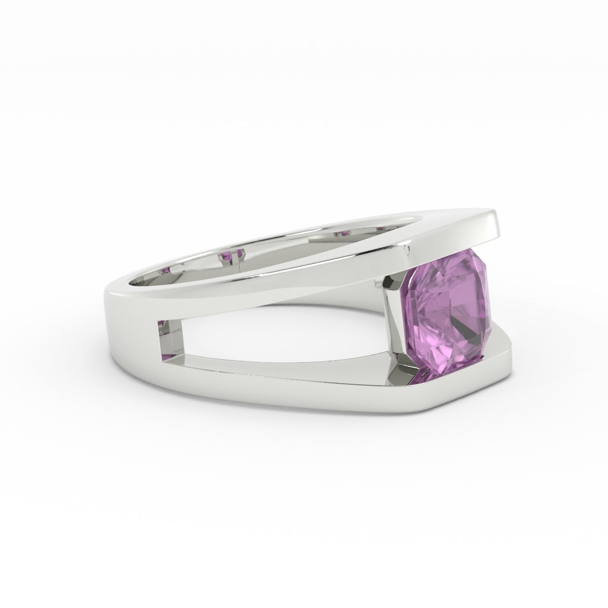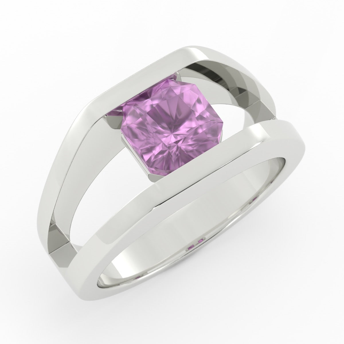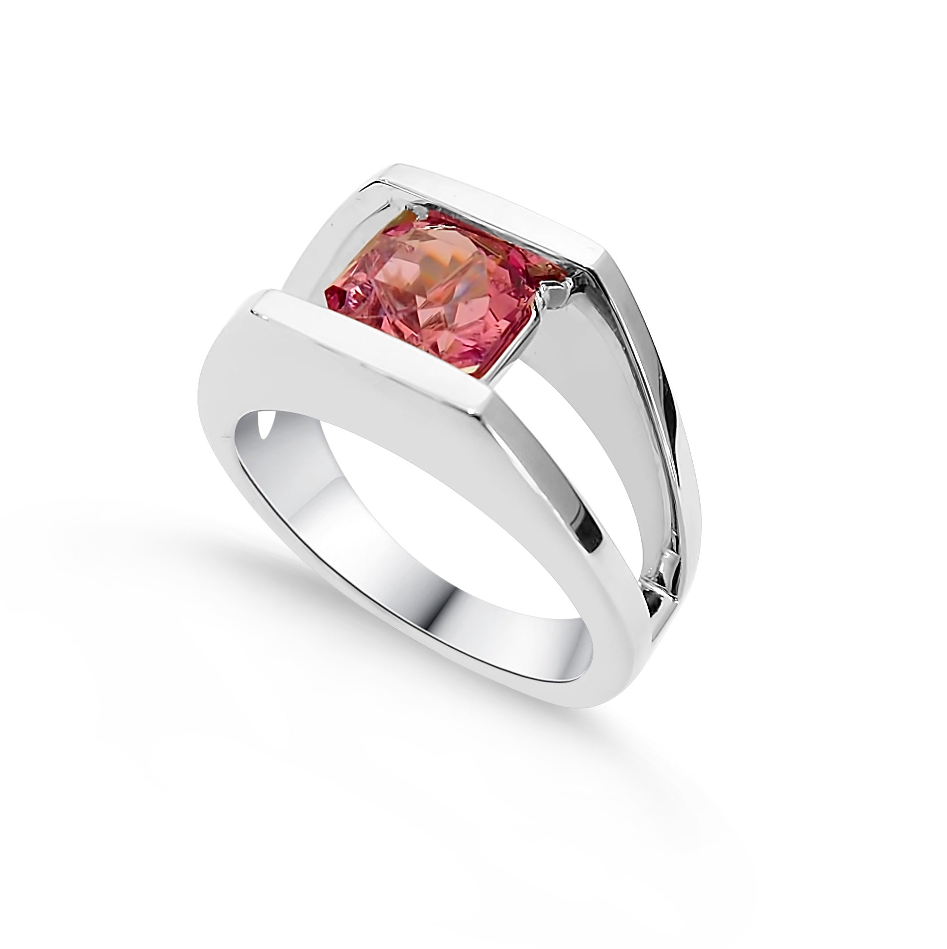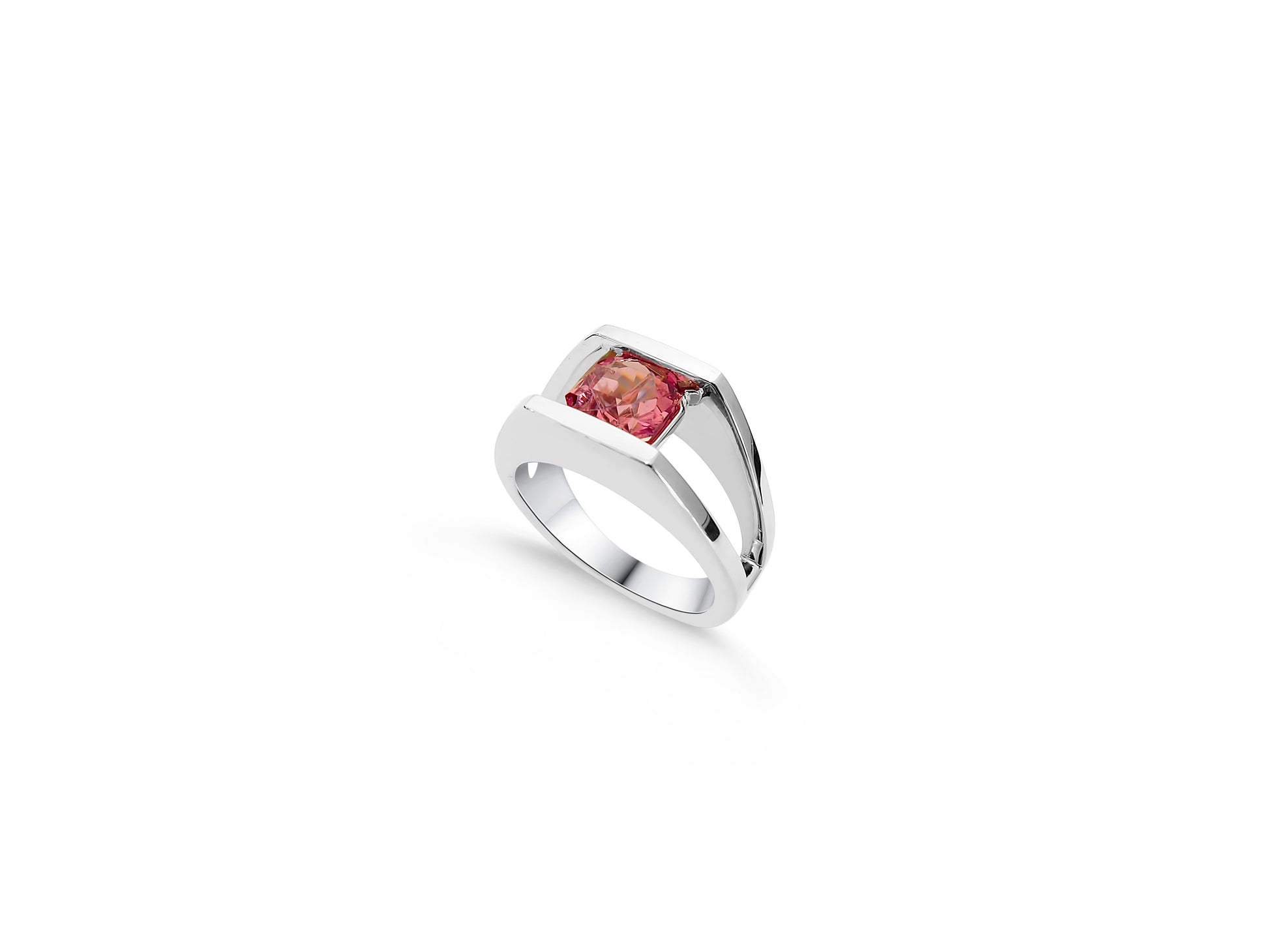 Intense fancy pink spinel set in custom white gold setting. This ring uses negative space to give a lightness to a wide ring.