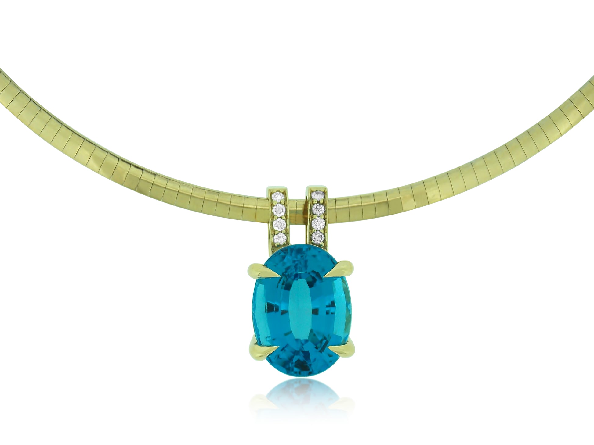 This custom pendant featured a 30 carat vivid blue topaz stone set with elongated claw prongs and a double diamond bail. The pendant is worn on a wide gold omega collar.