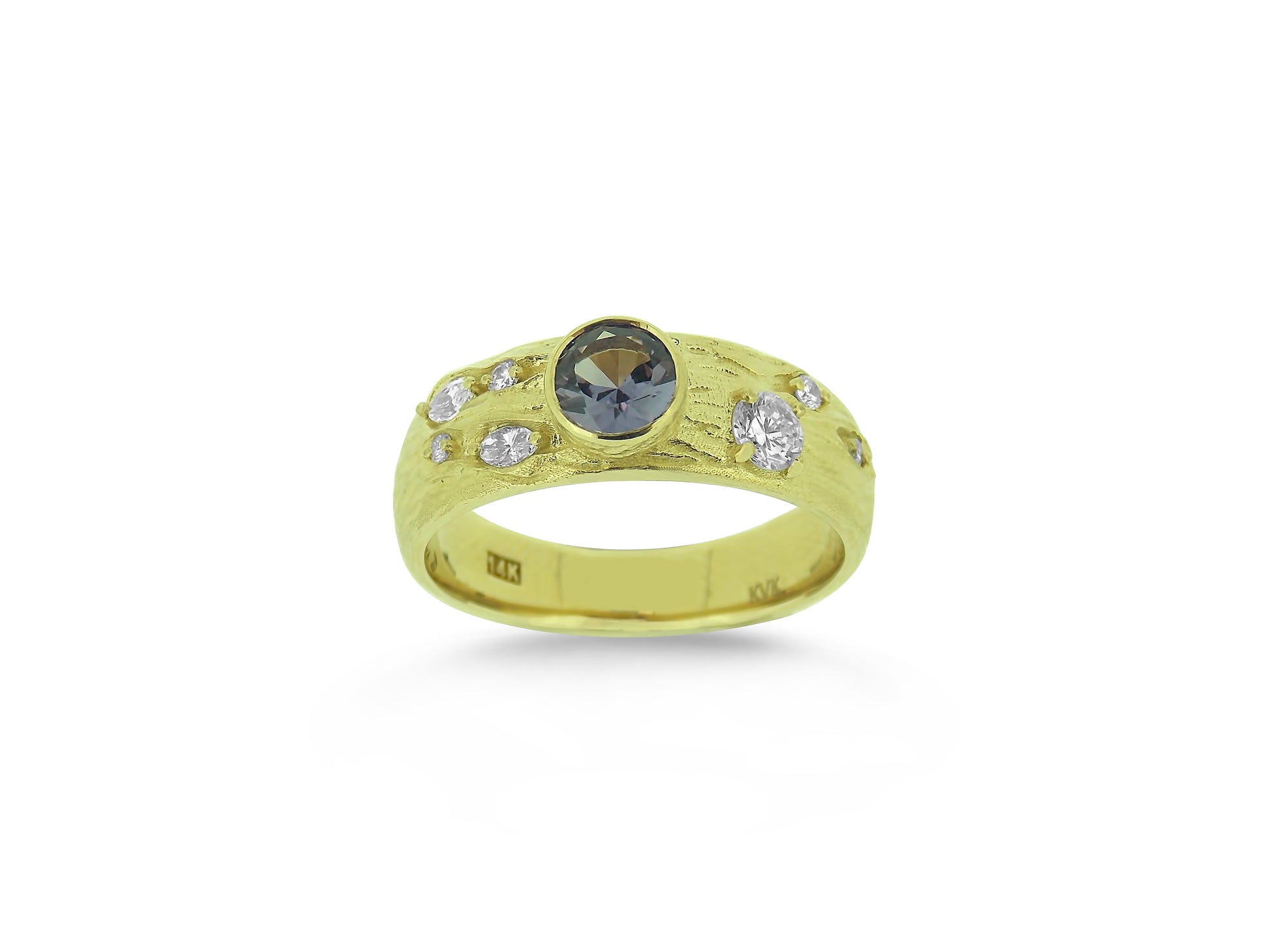 This client has a treasured center colored stone from her Mother. That was the focal point of the ring with the gold gently waved with different shaped diamonds scattered in the folds of the mounting. Beautiful, heavy, hand made - one of a kind creation by KVK.