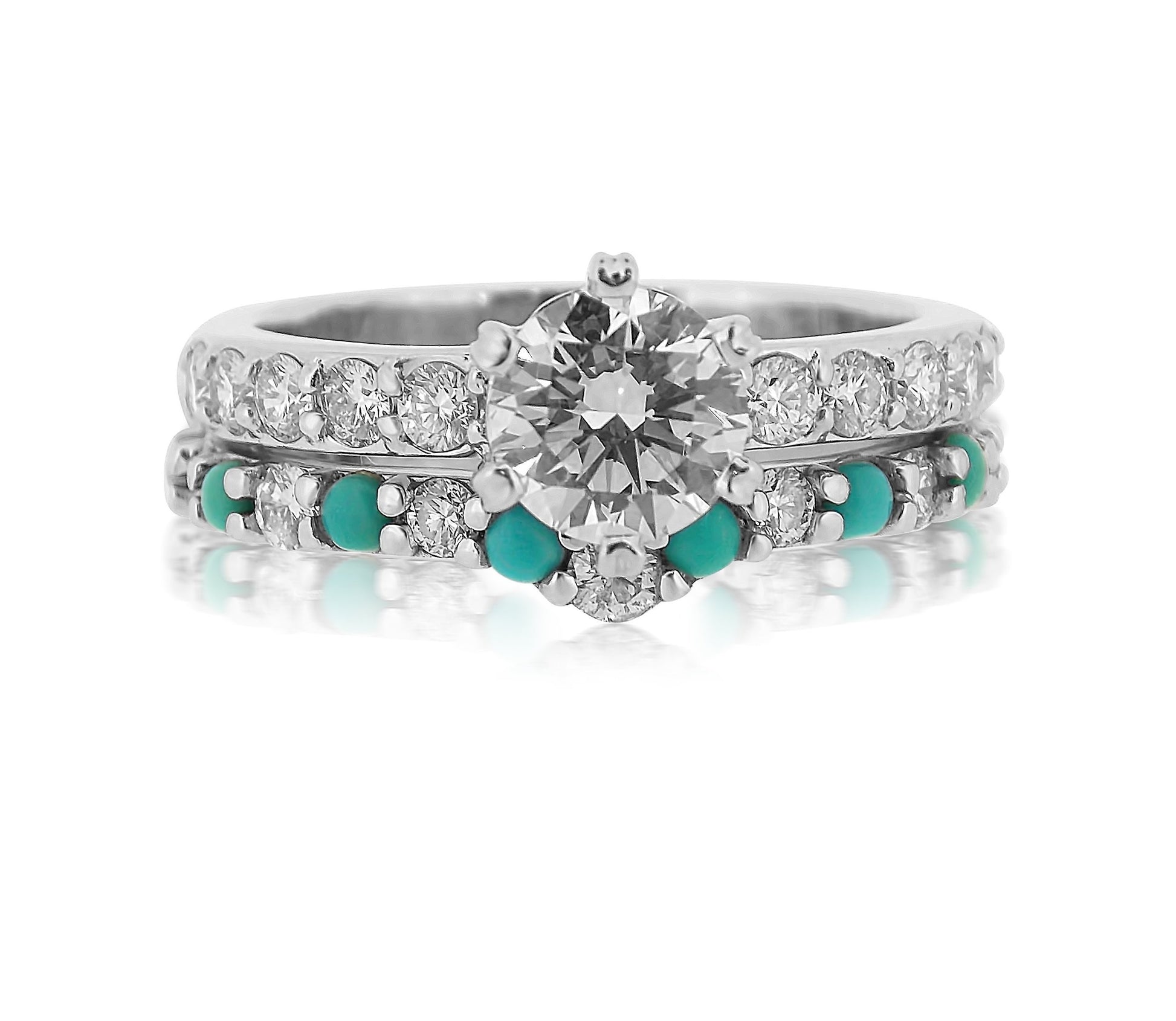 Beautiful custom made engagement ring featuring a stunning 1 carat center diamond. The bride wanted a turquoise wedding band and with clever brainstorming from the groom we made her the ideal wedding set. Great custom ring for a great couple!